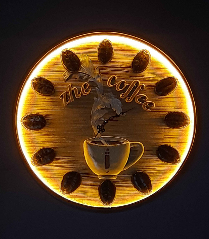 ساعت دیواری منحصربهفرد با طراحی اختصاصی برای کافه ژ؛ ترکیبی از چوب طبیعی و عناصر گرافیکی مرتبط با فضای گرم کافه. انتخابی عالی برای تزئین دیوار، با سبک هنری و حس دعوتکننده.