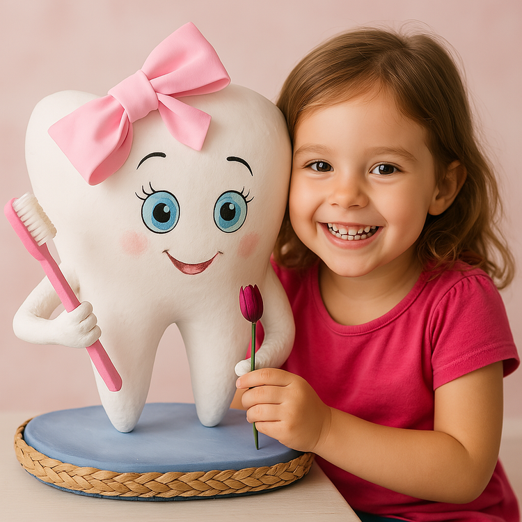 این ماکت فانتزی با طراحی دخترانه شامل چشمان آبی، لبخند کودکانه، پاپیون صورتی، گل تزئینی و مسواک رنگی، انتخابی عالی برای تزئین کلینیکهای دندانپزشکی کودکان، استفاده در تلیههای کودک و جشن اولین دندان کودک شماست. ترکیب رنگهای شاد و شخصیت دوستداشتنی این ماکت، فضایی گرم و صمیمی ایجاد میکند و عکسهای یادگاری شما را خاصتر میسازد.