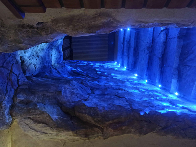 این تصویر یک گذرگاه سنگی باریک را نشان میدهد که پلههای آن با نور LED آبی حاشیهگذاری شدهاند و فضای غارگون، عمق و جذابیت بصری قدرتمندی ایجاد کرده است. دیوارهها و سقف از بافت سنگ طبیعی ساخته شدهاند که حس دستساز بودن و اصالت را منتقل میکند. در انتهای پلهها یک در یا مانع چوبی دیده میشود که حس کنجکاوی بازدیدکننده را تحریک میکند.
