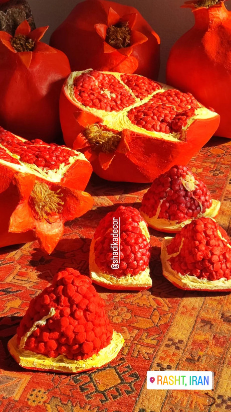 ماکت انار پاپیه ماشه با پوشش سرامیک و رنگ های تیوپی با کیفیت بسیار مستحکم در سایزهای مختلف ماکت انار کامل و نصفه و برش خورده